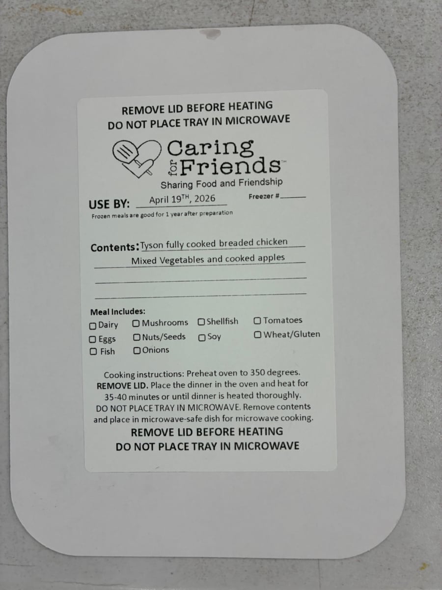 This time, the meals consisted of cooked breaded chicken breast, mixed vegetables, sliced apples and green beans.