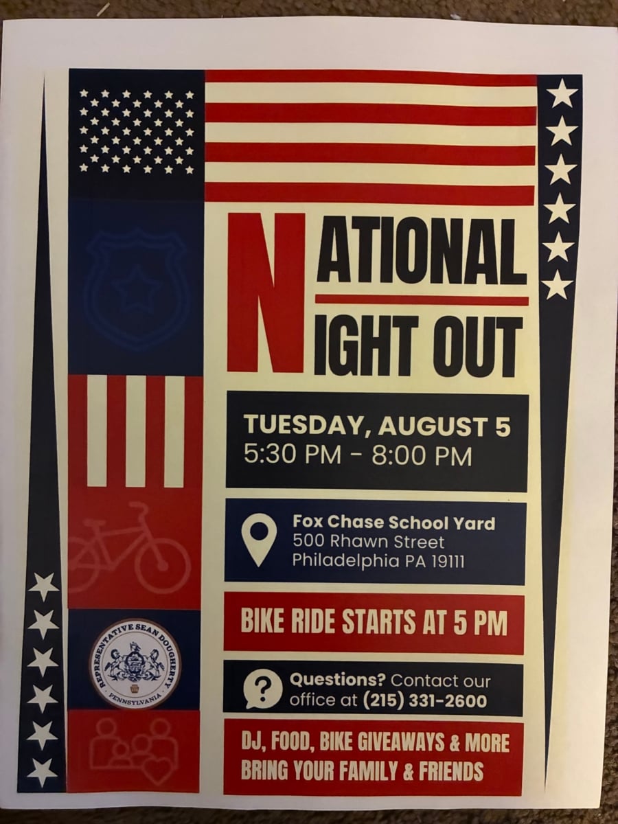 • National Night Out will take place on Tuesday, Aug. 5, from 5:30 to 8 p.m., in the Fox Chase Elementary School yard, 500 Rhawn St. A bike ride will start at 5 p.m. There will be a DJ, food and bike giveaways. Call 215-331-2600.