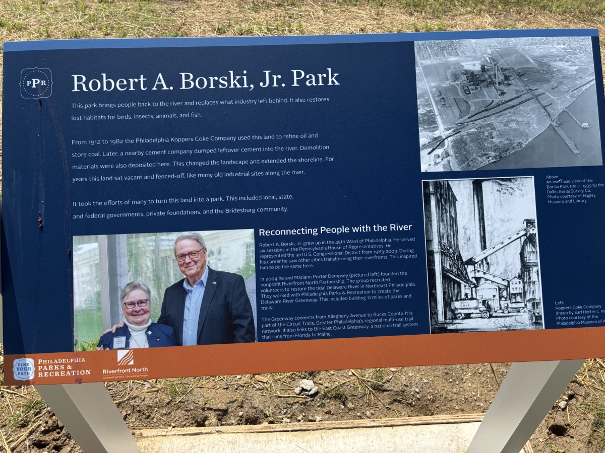 The park, near the Betsy Ross Bridge, features nice riverfront views, a multi-purpose lawn, an upland meadow, walking trails, benches, signage, a water fountain/filling station, restrooms and parking. “Borski Park” banners hang along Orthodox Street leading to the park. A new Friends of Borski Park group will partner with Riverfront North to hold free outdoor and volunteer programs throughout the year. The park is the result of more than $7.1 million in private, local, state and federal support.
