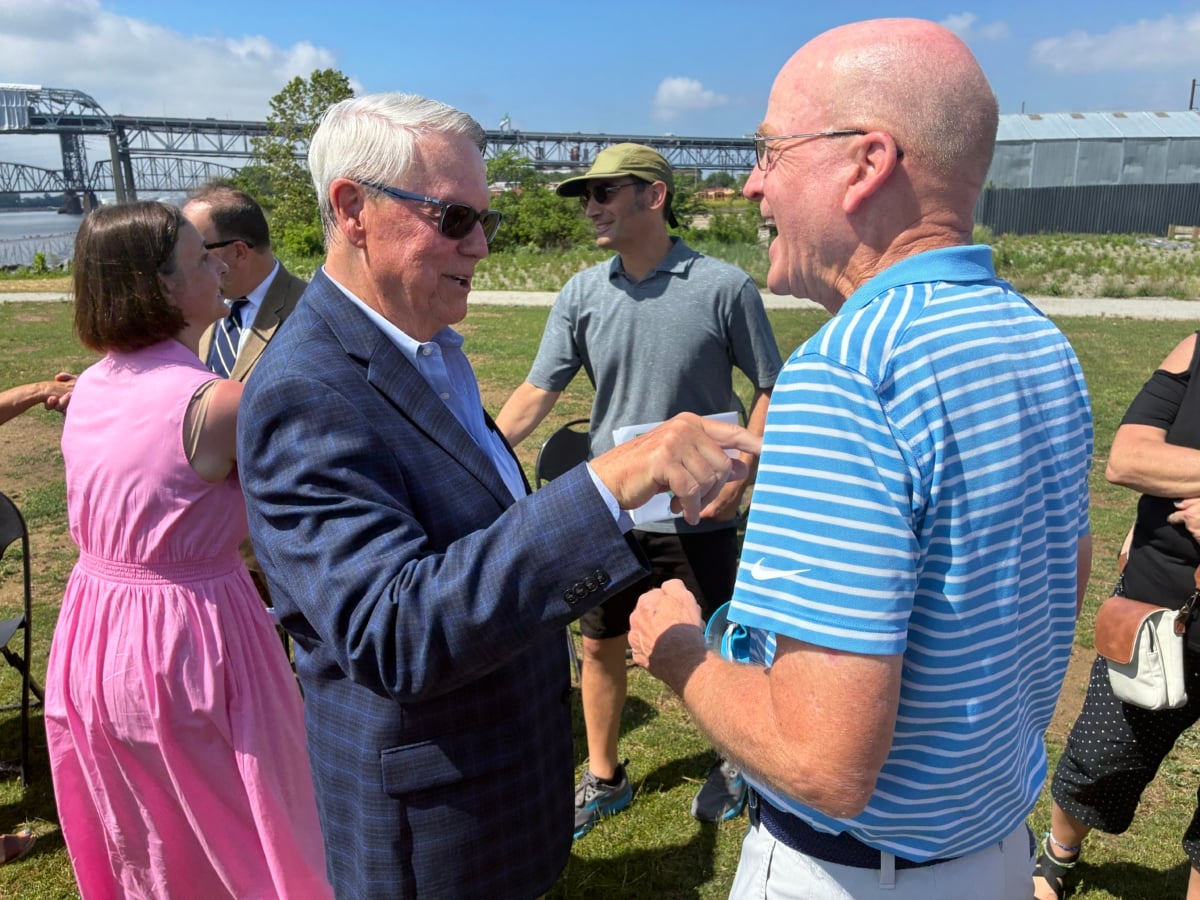 Borski thanked former Riverfront North board member Patrick Starr for helping create the master plan. He also pointed to a sign that has him pictured with Mariann Dempsey, who worked for him when he served in the state and U.S. House and with Riverfront North.