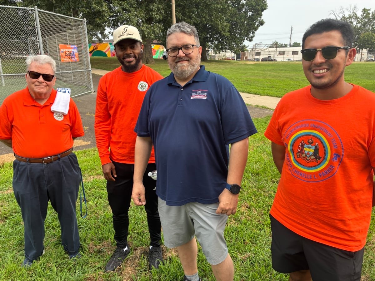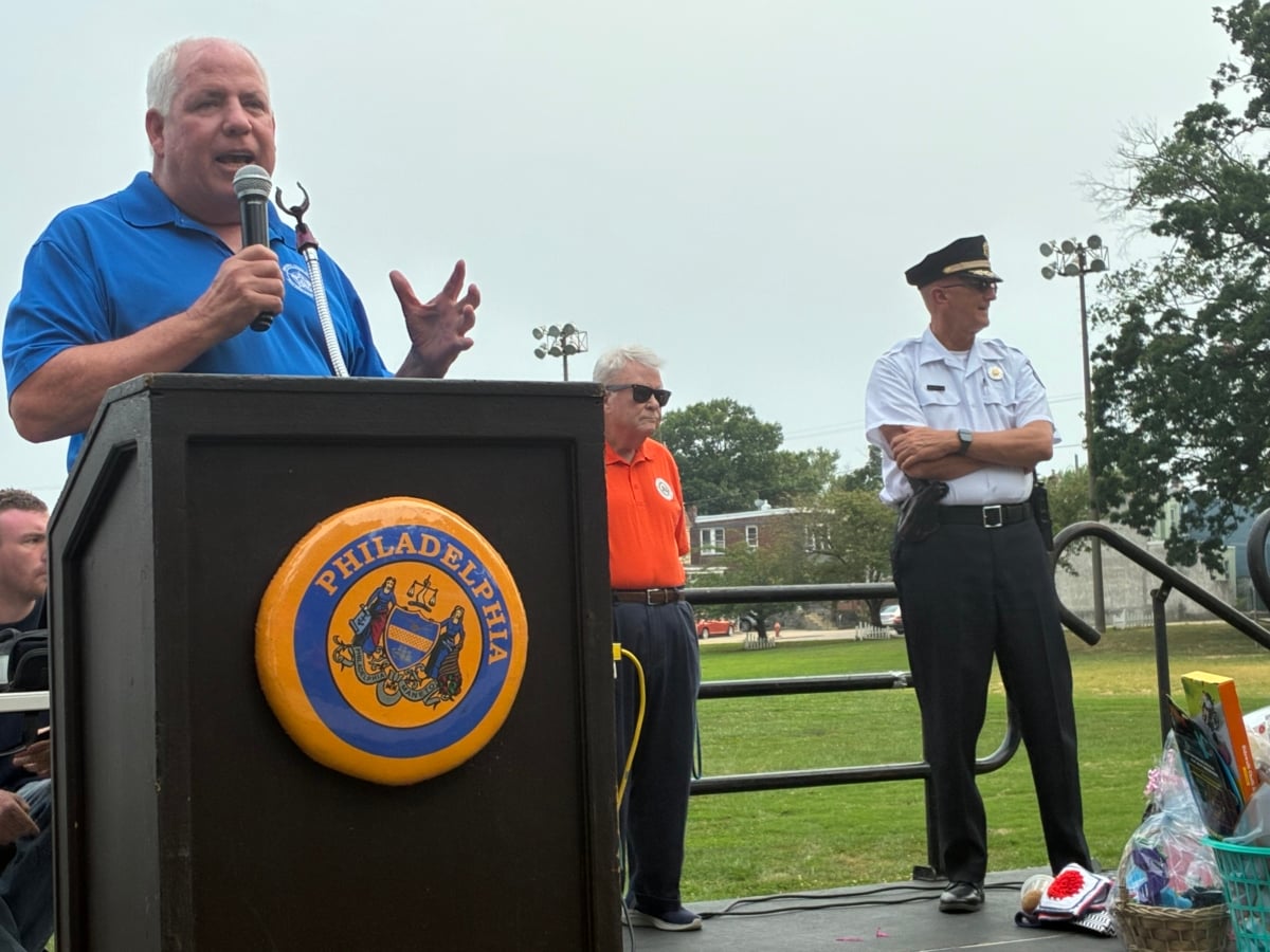 At Russo Park were Fran Torres (second from tight), an aide to Rep. Pat Gallagher, and 6th Councilmanic District Neighborhood Community Action Center representatives Terry Devlin, Basil Lester and Oscar Lopez.Councilman Mike Driscoll speaks at Russo Park, along with Inspector Frank Bachmayer and Terry Devlin, of the 6th Councilmanic District Neighborhood Community Action Center.