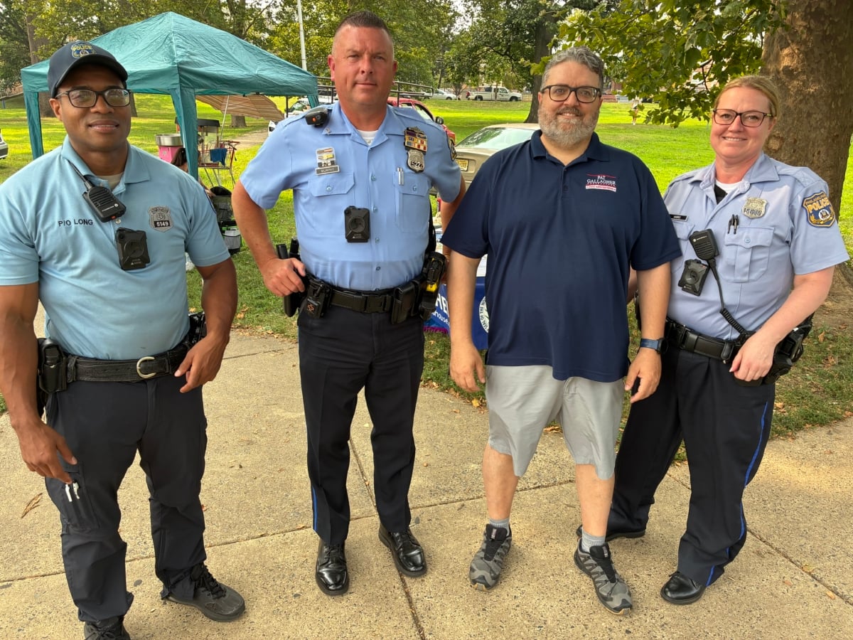 At Russo Park, 15th Police District officers Khari Long, John Murphy and Amy Marks spoke with Fran Torres, an aide to Rep. Pat Gallagher.