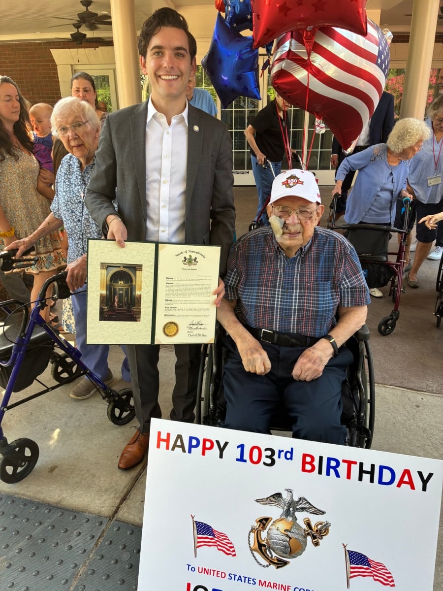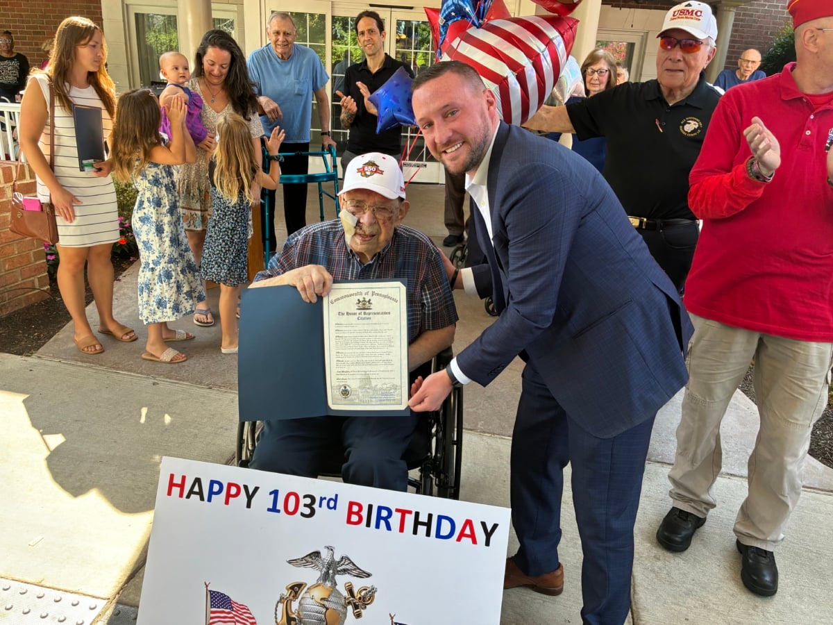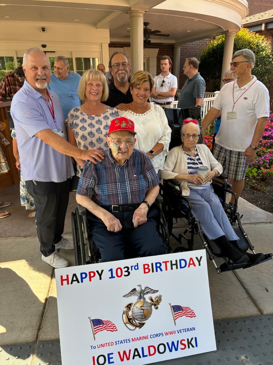 The Marine Corps League Detachment 281 All Divisions on Friday organized a celebration of Joe Waldowski’s 103rd birthday outside his residence at Paul’s Run, 9896 Bustleton Ave.