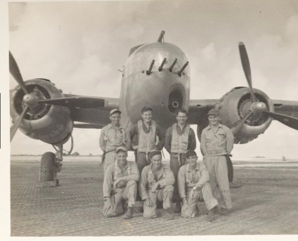 While in the Pacific, as a member of the Marine’s Bombing Squadron (VMB-613), he was the radioman/waist gunner on a B-25 bomber. They flew reconnaissance and bombing missions among the Marshall Islands, Iwo Jima, Saipan and Kwajalein. He was awarded the Air Medal for meritorious achievement in aerial fights in the central Pacific, and the Asiatic Pacific Campaign medal.