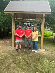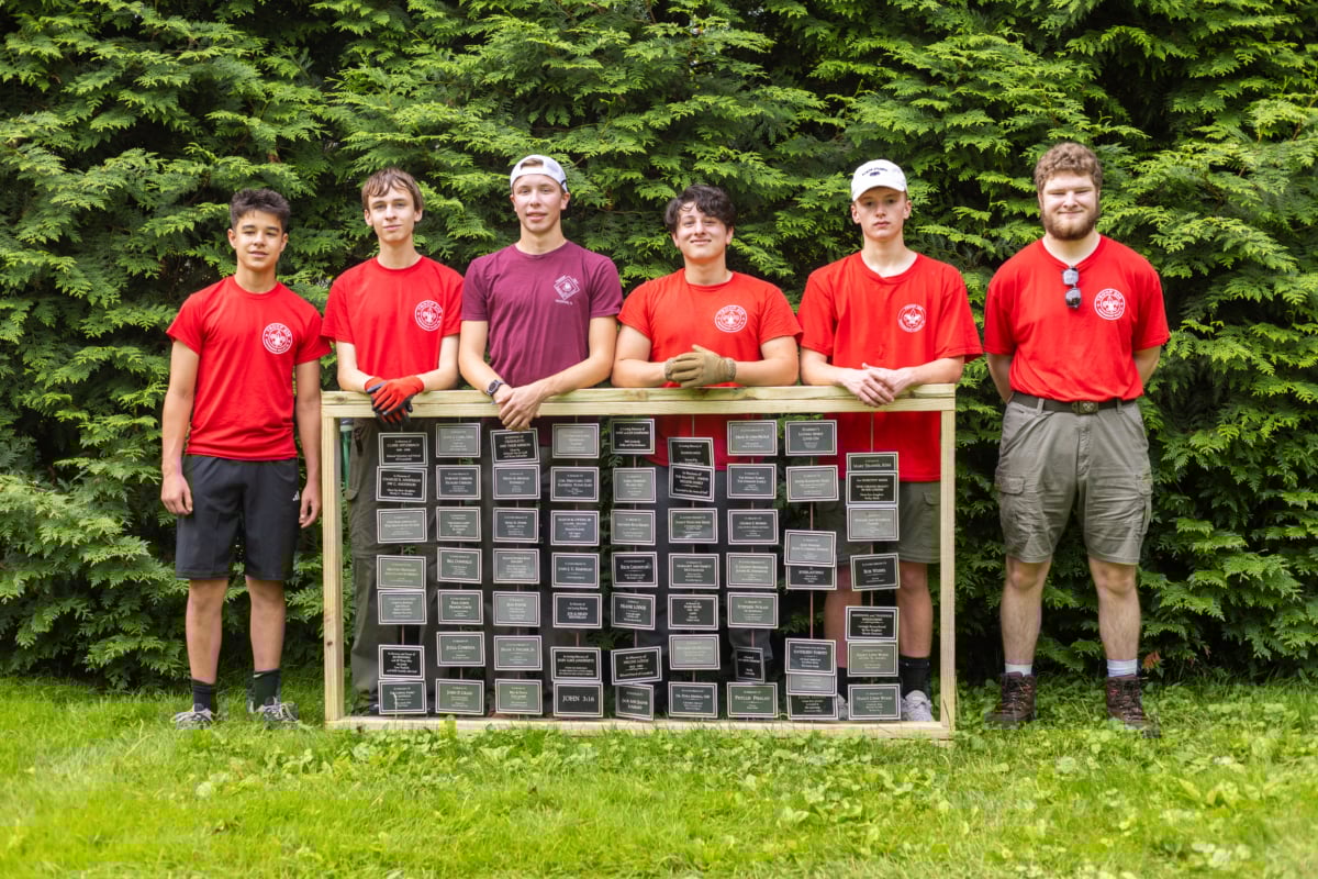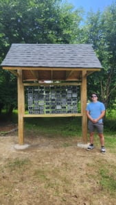 As Ayden explained, an approved Eagle Scout project must benefit the community in some way. Ayden’s project is the Thuja Memorial Kiosk, a 14-foot-high structure featuring 63 plaques that were purchased as part of a Cranaleith fundraiser.