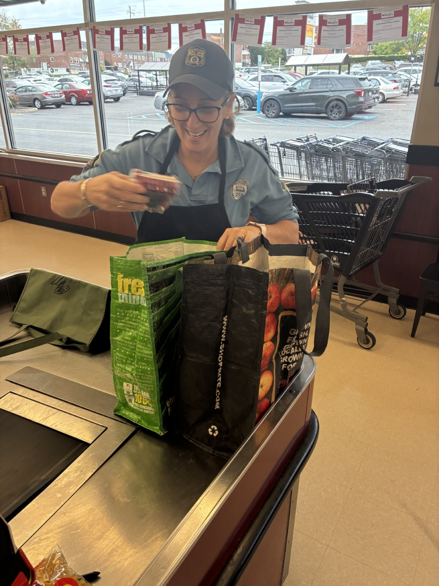 Among those bagging groceries were state Rep. Ed Neilson and 8th Police District community relations officer Cinnamon Hill and victims assistance officer Chalie Squares.