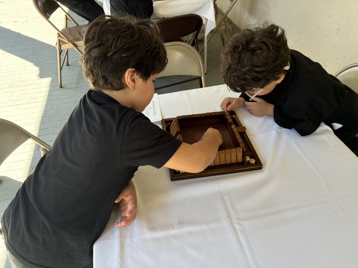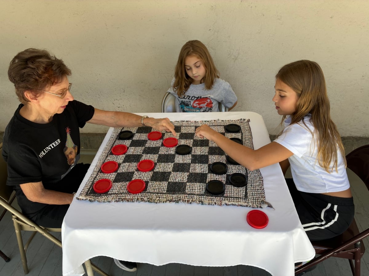 Sisters Ivy and Mila Lamare challenge a Ryerss volunteer to a game of checkers.