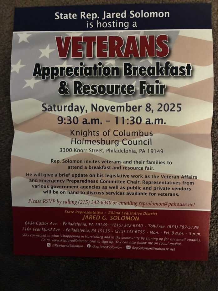 • State Rep. Jared Solomon will hold a veterans appreciation breakfast and resource fair on Saturday, Nov. 8, from 9:30 to 11:30 a.m., at the Knights of Columbus Holmesburg Council, 3300 Knorr St. Veterans and their families are invited. Representatives from various government agencies as well as public and private vendors will be on hand to discuss services available for veterans. To RSVP, call 215-342-6340 or email [email protected].