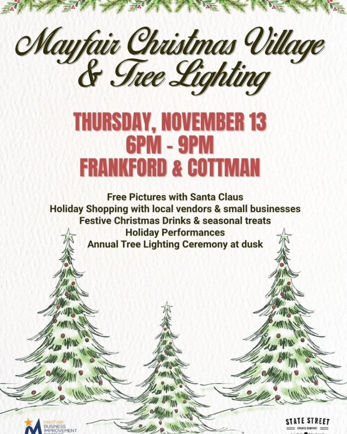 The Mayfair Business Improvement District will sponsor a Christmas village and tree lighting on Thursday, Nov. 13, from 6-9 p.m., at Frankford and Cottman avenues.