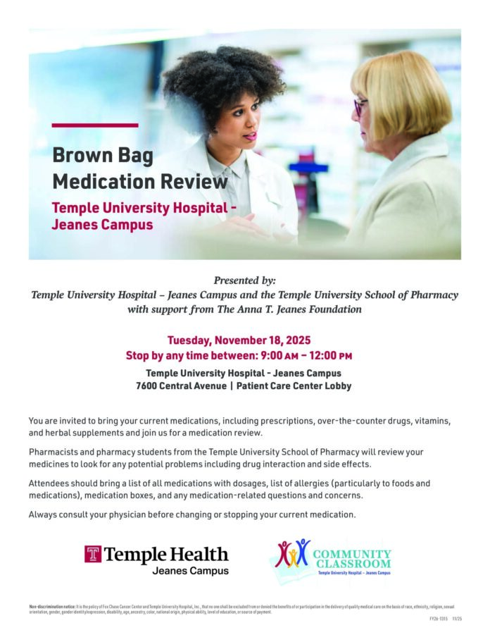 Temple University Hospital — Jeanes Campus, 7600 Central Ave., will host Brown Bag Medication Review on Tuesday, Nov. 18, from 9 a.m. to noon, in the patient care center lobby.