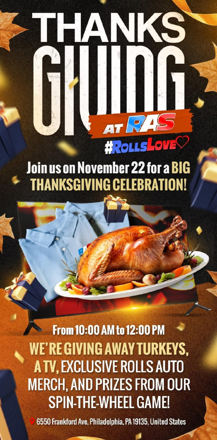 Rolls Auto Sales, 6550 Frankford Ave., will host its annual Thanksgiving turkey giveaway on Saturday, Nov. 22, at 10 a.m.