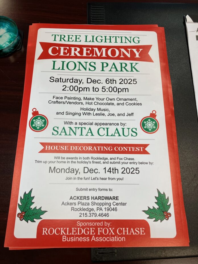 The Rockledge Fox Chase Business Association will hold a tree-lighting ceremony at Lions Park, 7964 Oxford Ave., on Saturday, Dec. 6, from 2-5 p.m.