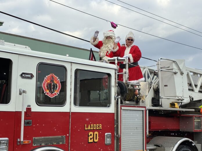 Santa and Mrs. Claus arrived on the Ladder 20 fire truck, with snowflakes in the air.