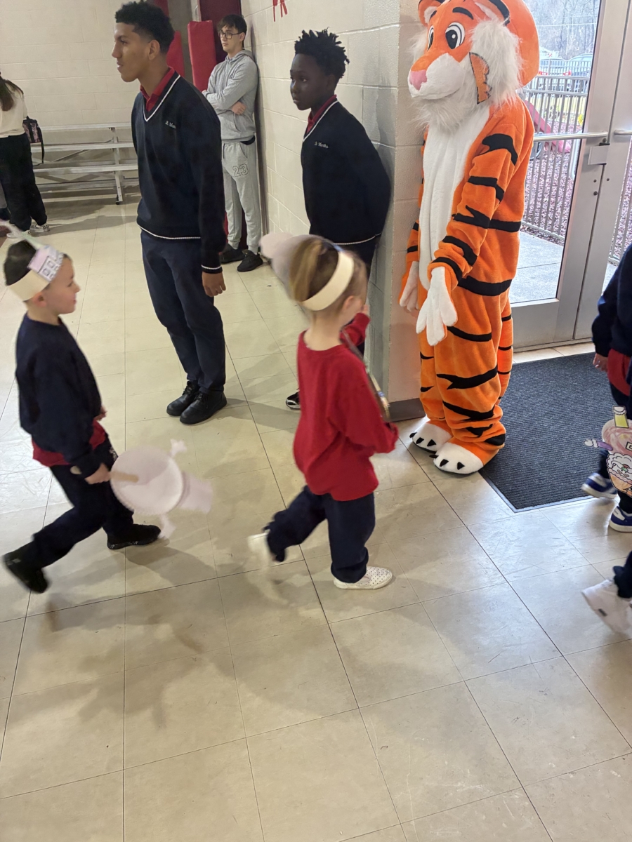 On Nov. 26, 200 students in Pre-K3 through eighth grade marched around the gym, with each class wearing Thanksgiving-related gear and carrying banners and their version of floats, as parents and other family members watched.