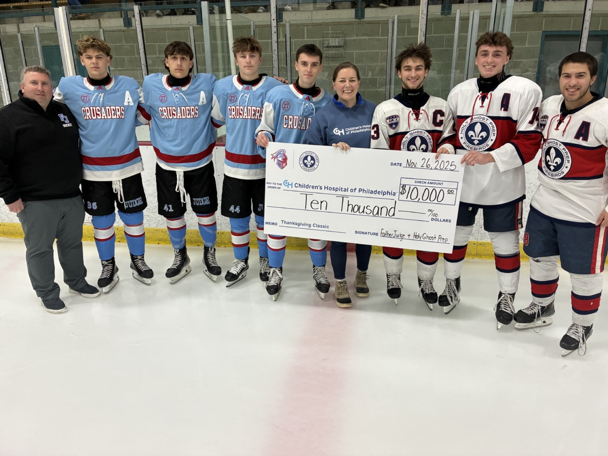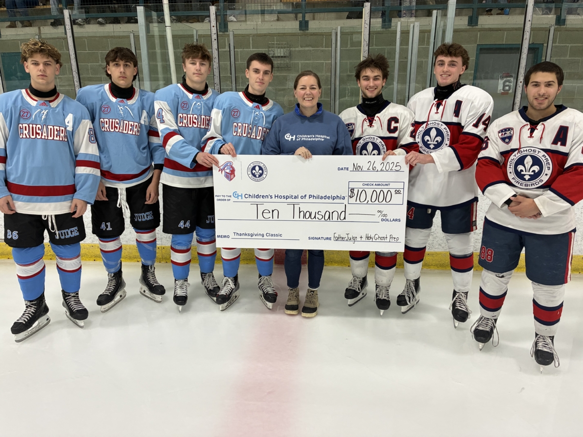 Right after Holy Ghost edged Judge, 3-2, in the JV game, players from both programs skated onto the ice to present a $10,000 check to Children’s Hospital of Philadelphia.