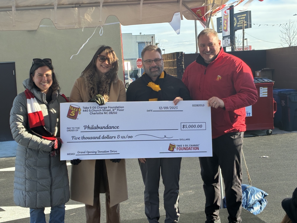 To celebrate its Philadelphia debut, Take 5 Oil Change last week held a ribbon-cutting ceremony, presented Philabundance with a check for $5,000 and gave out cheesesteaks from Steve’s Prince of Steaks.