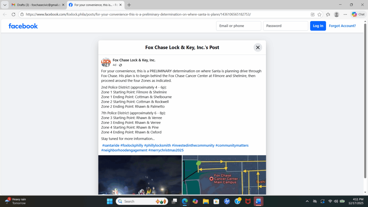 For a map and details on times and his route, visit https://www.facebook.com/foxlock.phila/posts/for-your-convenience-this-is-a-preliminary-determination-on-where-santa-is-plann/1436106565182753/ or follow foxlockphilly on Instagram. ••