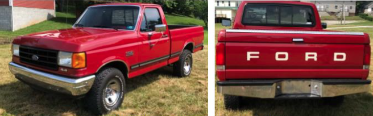 The vehicle is described as a 1987 to 1989 Ford F150 pickup truck, two-tone red.