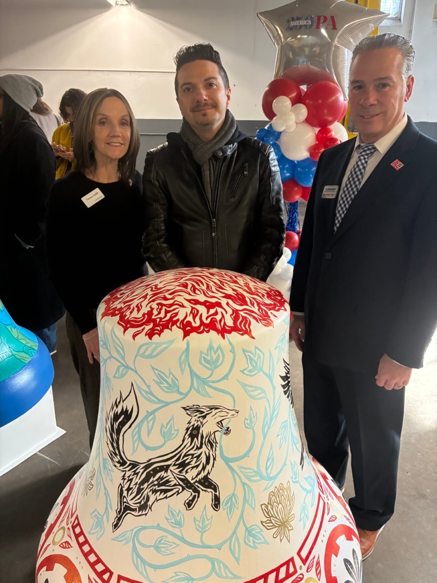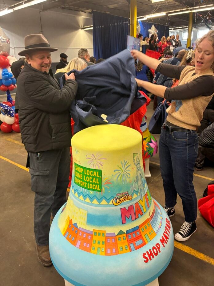 The Mayfair bell, Celebrate Mayfair, was designed by Alana Bogard and painted by Madeleine Smith. Mayfair Business Improvement District executive director Donny Smith was in attendance and said the bell will be placed on Frankford Avenue near Tudor Street, along with an existing “Greetings from Mayfair” banner and a Seward Johnson Atelier statue of Abraham Lincoln that will be installed.