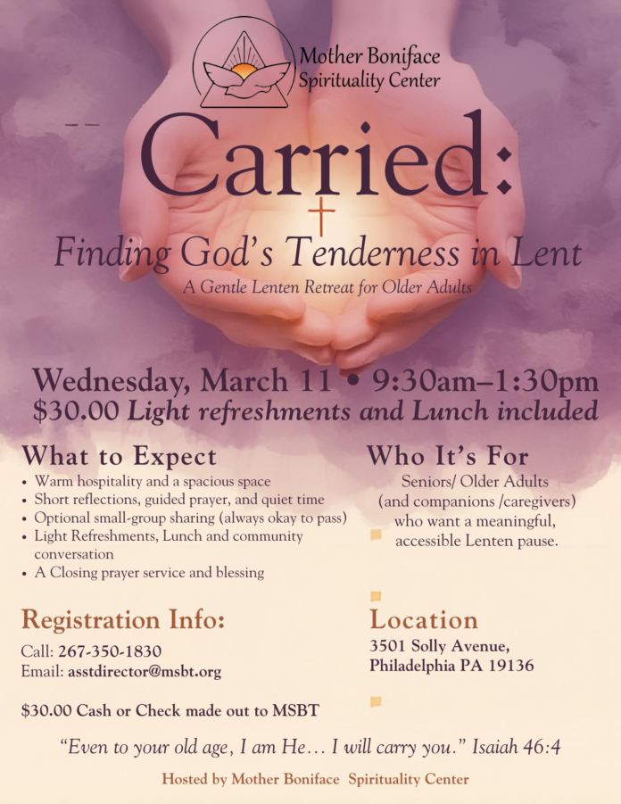 Mother Boniface Spirituality Center, 3501 Solly Ave., will host Carried: Finding God’s Tenderness in Lent on Wednesday, March 11, from 9:30 a.m. to 1:30 p.m.