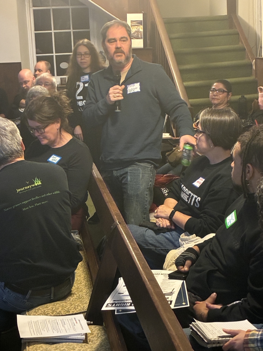 About 75 people attended, and received literature on immigration resources and a workplace protection plan, along with a red card to distribute to immigrants with wording that tells ICE they do not want to talk or provide documents and will not let agents into their houses unless they have a signed judicial warrant that is slid under the door.
