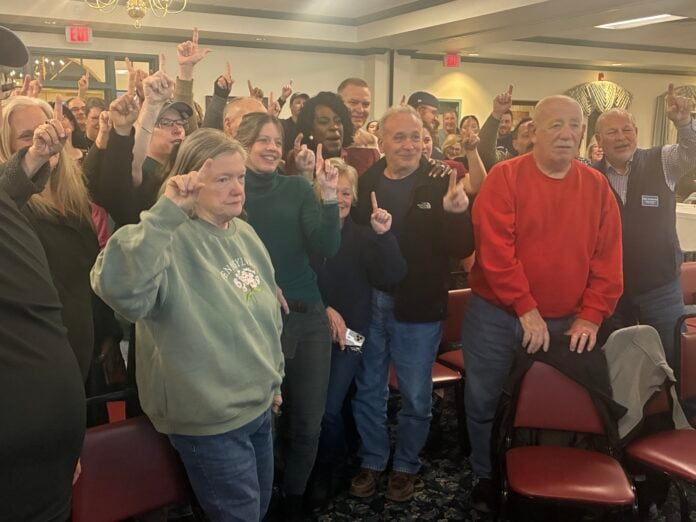Mayor Cherelle Parker and members of the Greater Bustleton Civic League put their fingers in the air to signify One Philly.