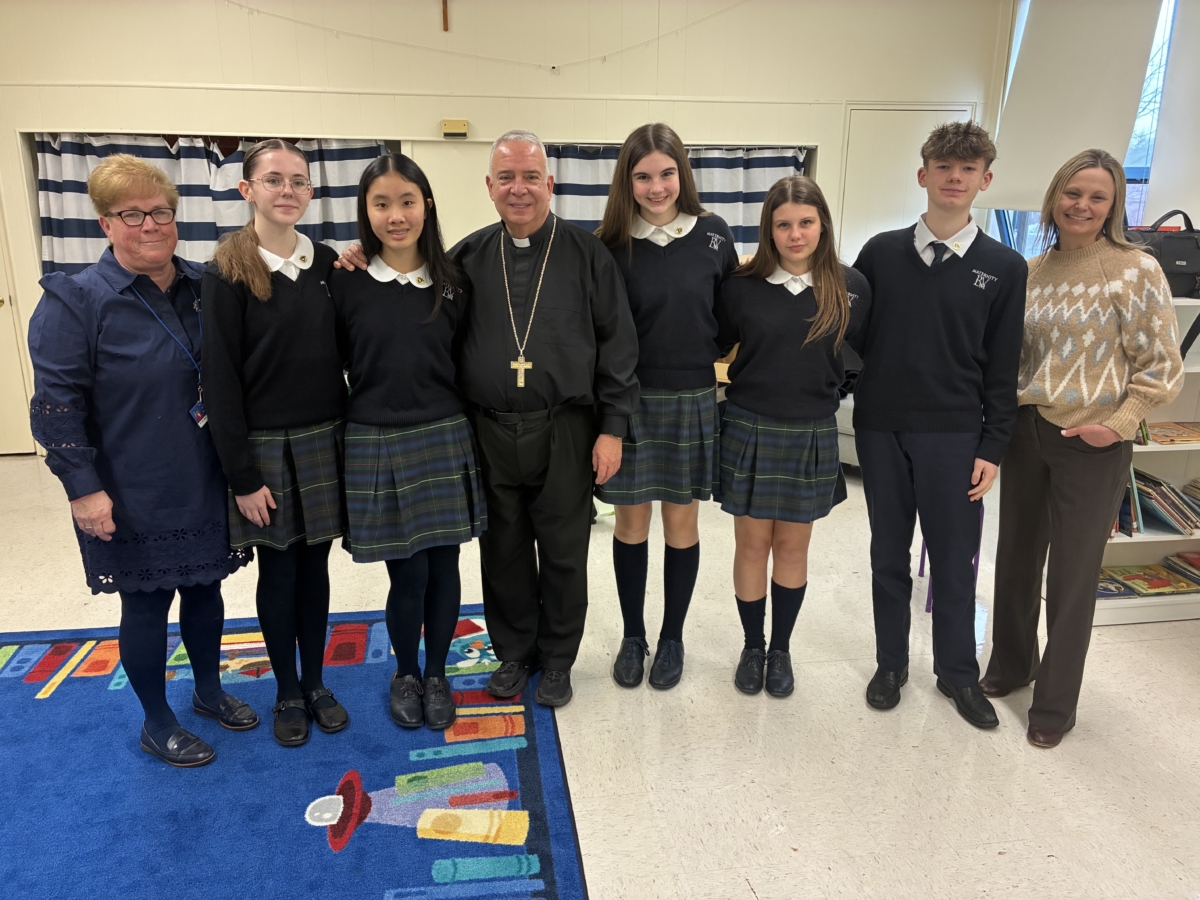 Students formed a receiving line outside the school and in the hallway to welcome Perez, with a sign above the doors reading, “Maternity BVM welcomes Archbishop Nelson Perez.” The archbishop met with student council officers in the library before his departure. ••