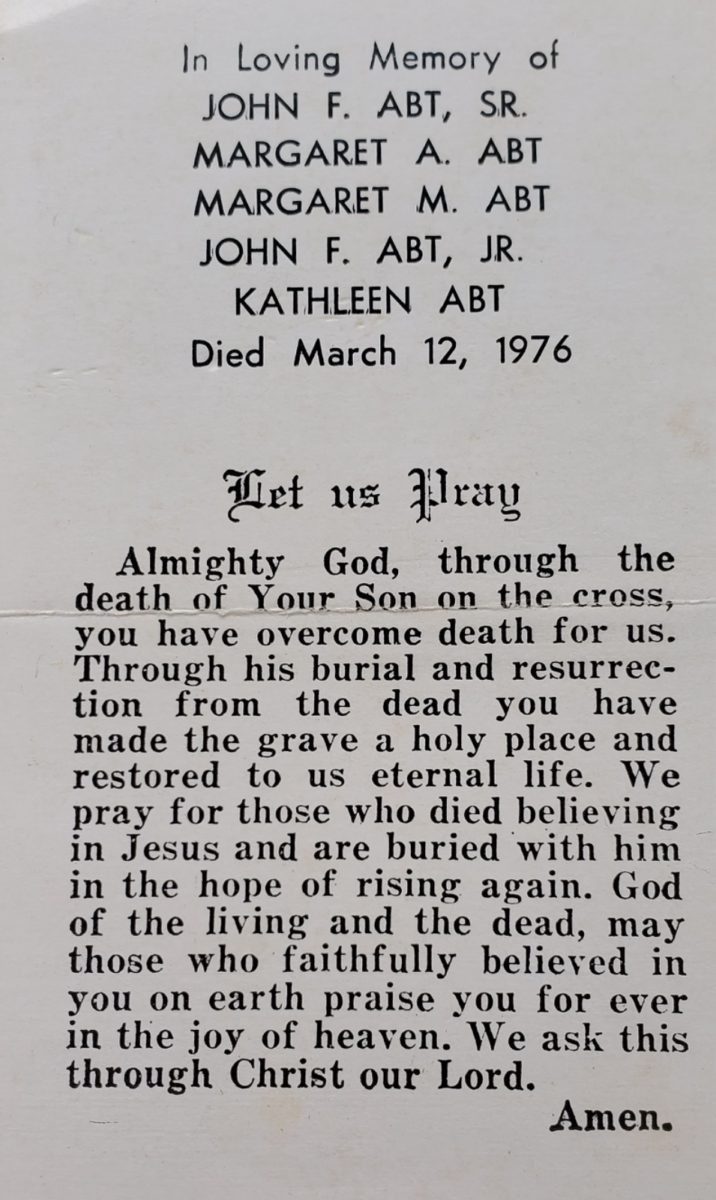 The John F. Fluehr & Sons holy cards read, “In Loving Memory of John F. Abt Sr., Margaret A. Abt, Margaret M. Abt, John F. Abt Jr., Kathleen Abt. Died March 12, 1976.”