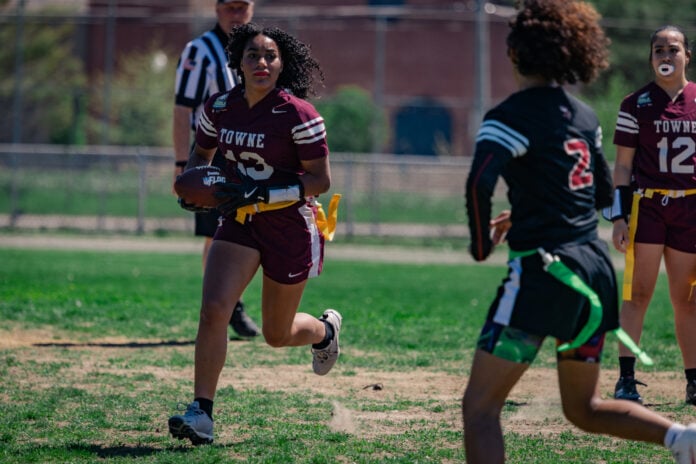 In the spring, however, she steps away from cheerleading, at least during flag football games where she’s one of the top players on the team.