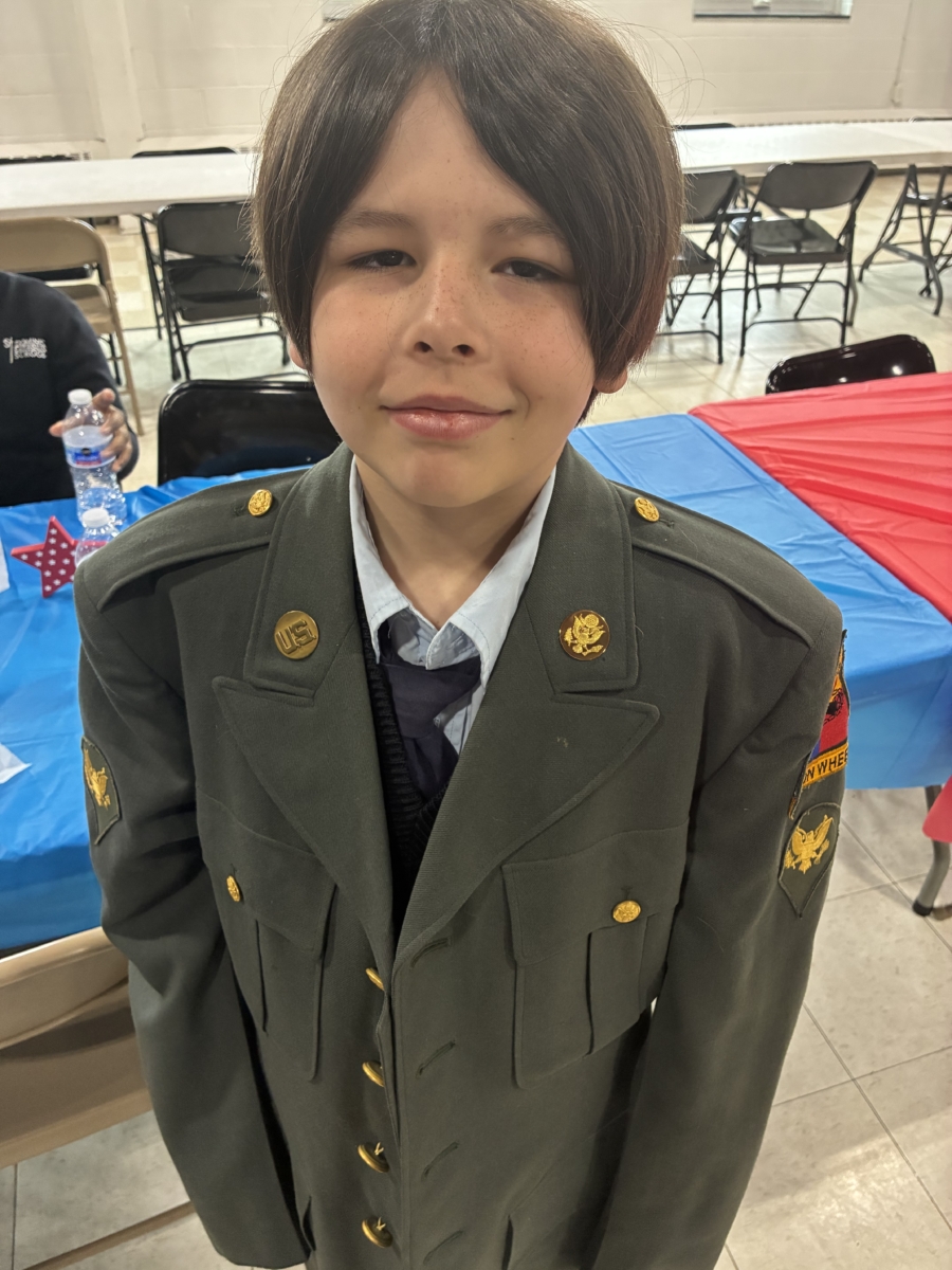 Eighth-grader Cadence Groomes led students and veterans in singing Lee Greenwood’s God Bless the USA and Kate Smith’s God Bless America, as students waved American flags and videos of the songs played. ••