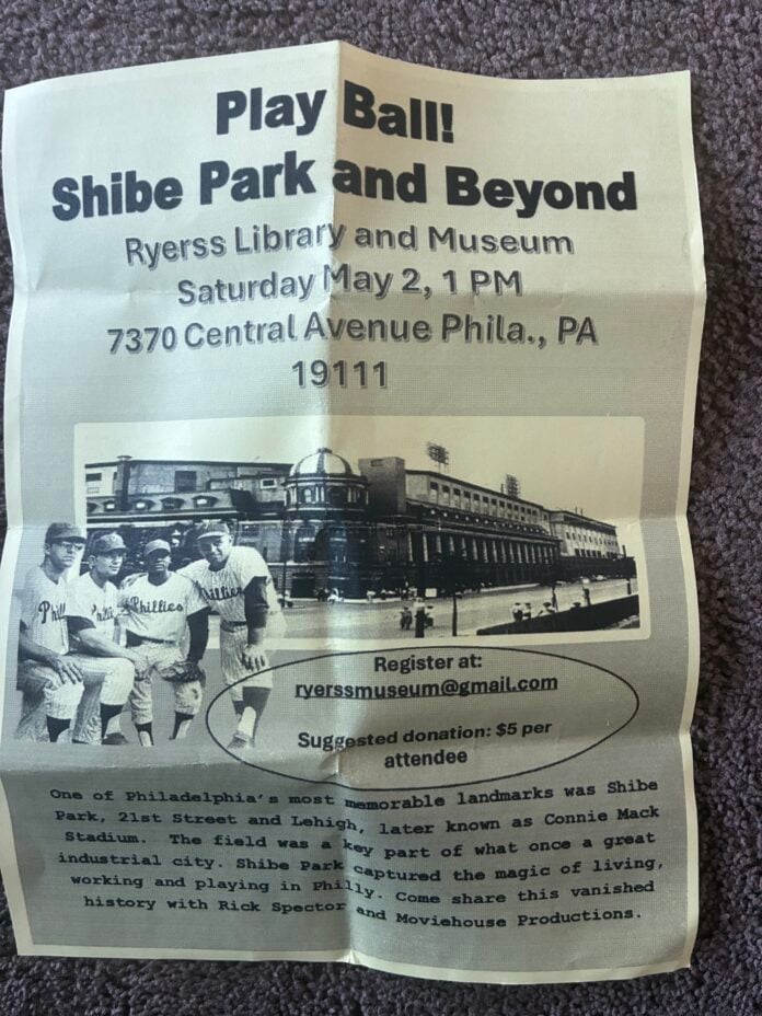 Rick Spector and Moviehouse Productions will present Play Ball! Shibe Park and Beyond on Saturday, May 2, at 1 p.m. at Ryerss Library and Museum, 7370 Central Ave. The suggested donation is $5. Register at [email protected]. ••