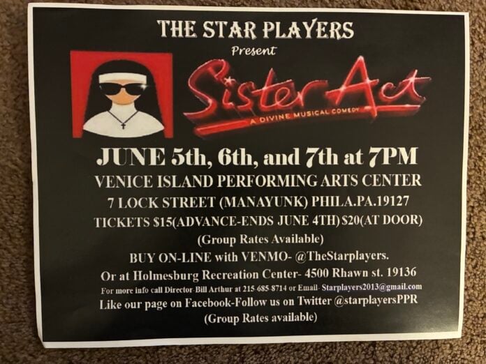In other news from the April 14 meeting, the Holmesburg Recreation Center-based Star Players will present three performances of the musical Sister Act. The show will be performed on June 5, 6 and 7 at 7 p.m. at Venice Island Performing Arts Center, 7 Lock St., in Manayunk. The cast will include state Rep. Joe Hohenstein as Pope Paul VI. Tickets are $15 in advance and $20 at the door. They are available for purchase through Venmo @TheStarplayers or at Holmesburg Recreation Center, 4500 Rhawn St. For more information, contact director Bill Arthur at 215-685-8714 or [email protected]. ••